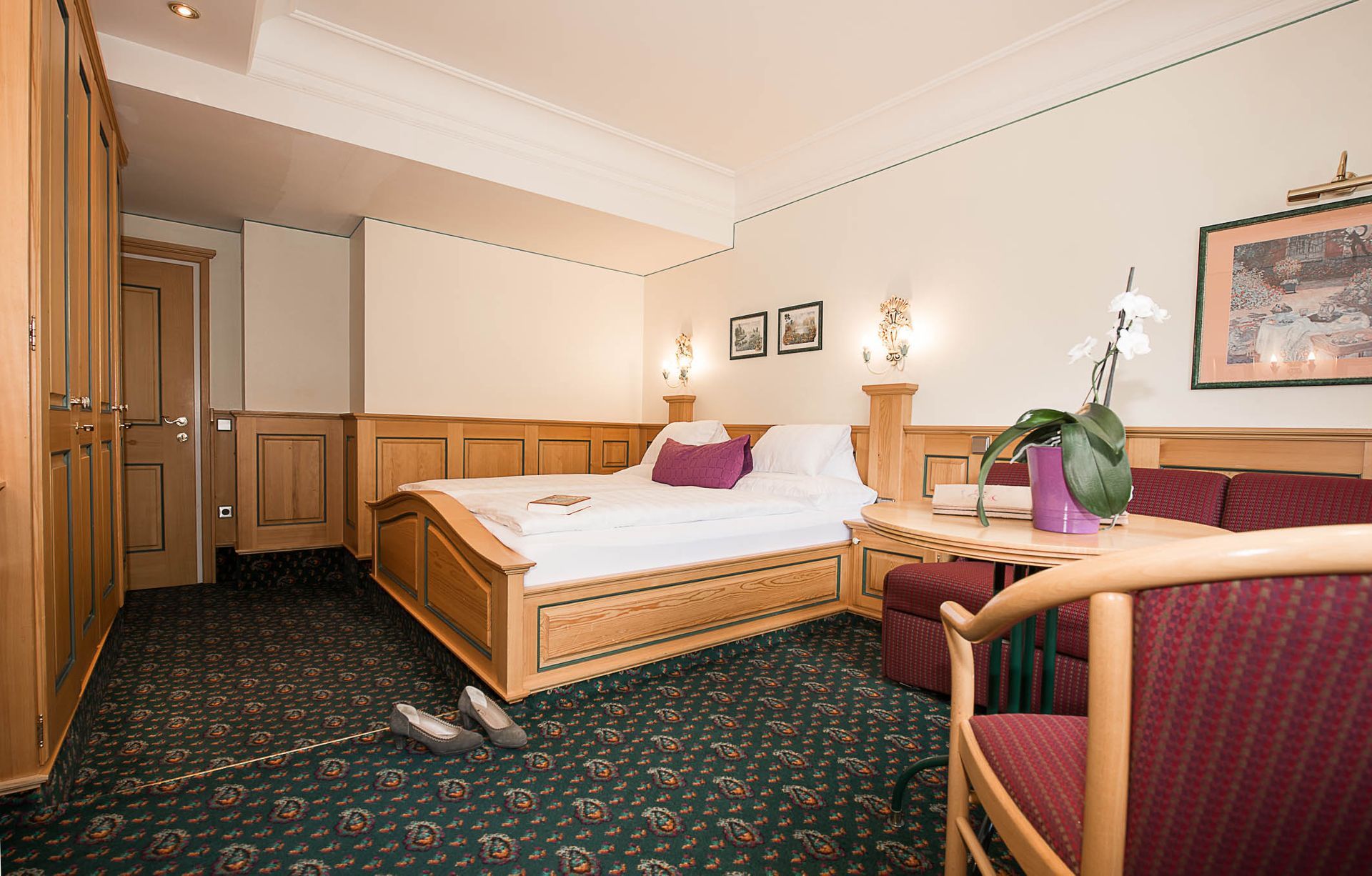 gemütliches familienzimmer, ausgestattet mit einem doppelbett und zwei einzelbetten, auch als doppelbett nutzbar.